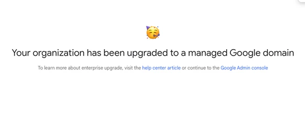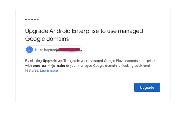- Via EMM API: Some EMMs may provide their own “upgrade” prompt or process using Google’s direct APIs. The steps are essentially the same - the EMM triggers the creation or linkage to a Managed Google Domain, and you supply a corporate email domain to either link or create the Google admin account. Speak to your EMM vendor for details on how to achieve this.