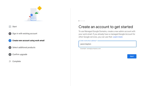- If you don’t have an existing Google domain, you can create a new Managed Google Domain on the fly using your work email’s domain. For example, if you enter it@company.com, Google will set up a Cloud Identity domain for “company.com”. You’ll verify your email address and later have the option to perform full domain verification (to unlock all features, e.g authenticate with Google, ChromeOS management, and more.