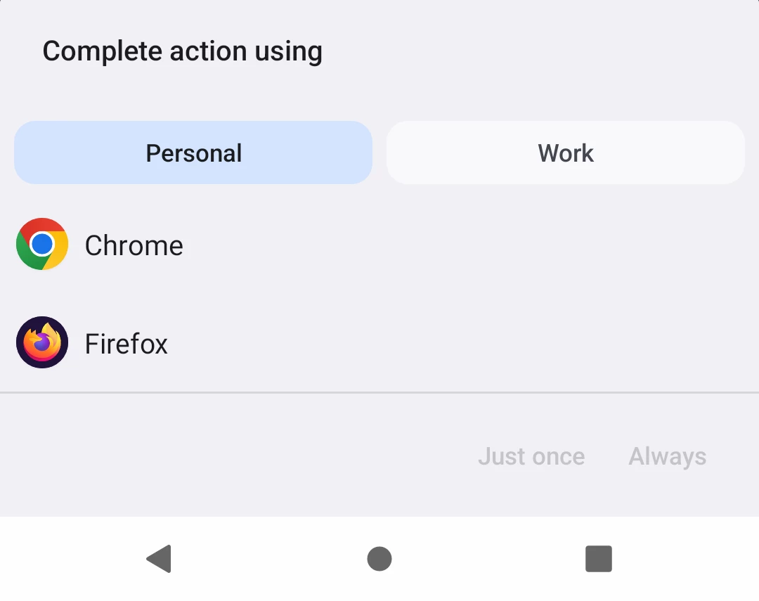 The problem with a permanently set default browser is that links from NFC tags are immediately opened in the personal space. If there is a copy & paste lock on the work profile, you cannot use the code. (Unless you type >40 characters) If you are asked for an app to open the URL, you can also select the browser in Work Profile.