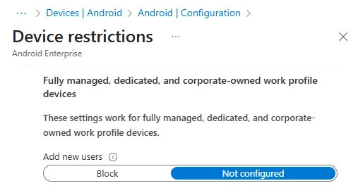 I've got a use case for some multi-user Android tablets and I'm trying to figure out the best solution. I know Android allows you to create secondary users by default but it appears that Microsoft Intune is disabling this setting automatically. Doesn't seem to be a way to allow it given that the only options are block or not configured. I put in a ticket with Microsoft and I'm sure their answer will be to use Microsoft Entra Shared Mode and the Managed Home Screen but that doesn't work very well.