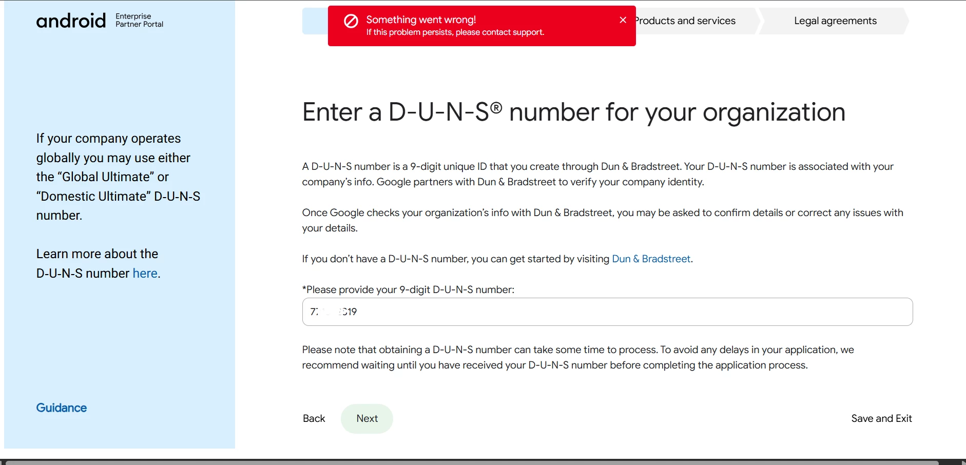 we are asked to verify our google developer accounts on the console. however, when trying to do so, our DUNS number was not working.