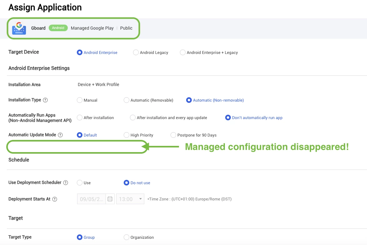The ability to apply a managed configuration to Gbaord has disappeared. We think this is due to a recent change to the Gboard app where Google has removed this ability.