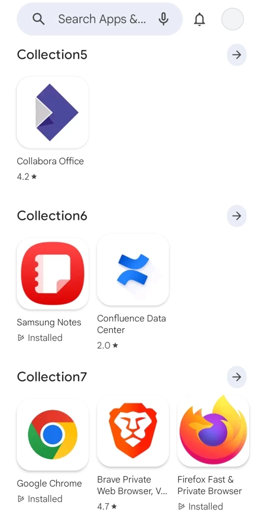 There are different types of collections in the normal Google Play Store. It would be useful to be able to choose between the different variants. (See ‘Popular apps’ / Business tools")