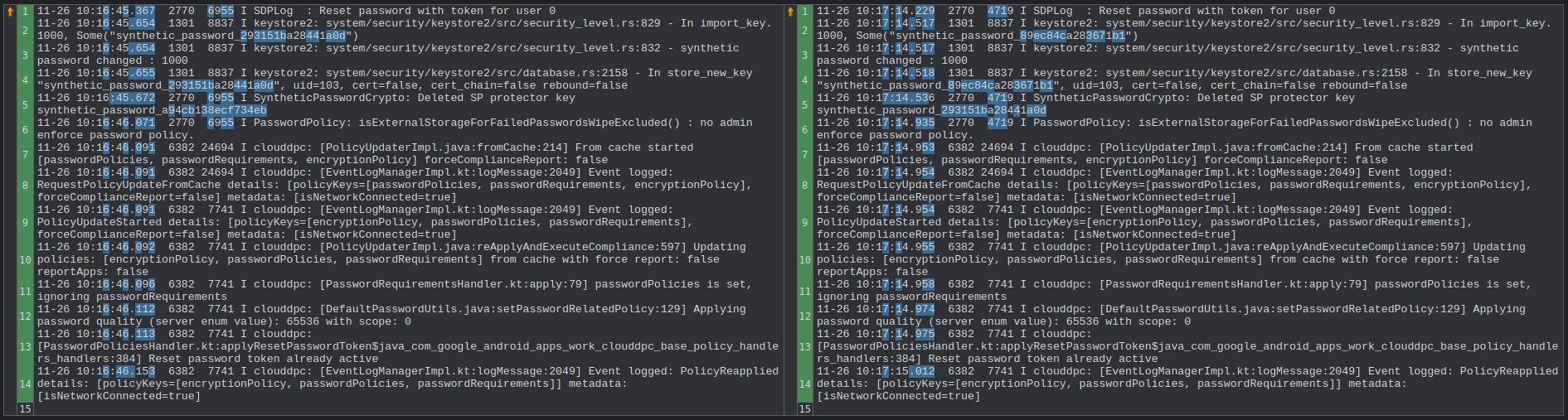 Now I started to look into the adb logs of my device. I sent two reset password commands, one with the Require Entry option enabled and one without. I grepped the logs for "password" as a keyword and compared the results with a tool.