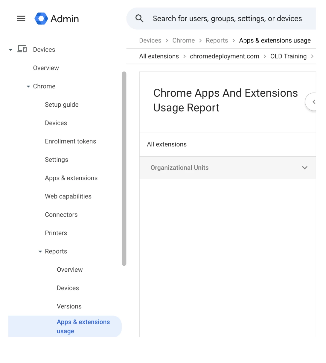 | 1. Sign In Log in to the Google Admin console | ➔ | 2. Navigate Devices > Chrome > Reports | ➔ | 3. View Select Apps & extensions usage |