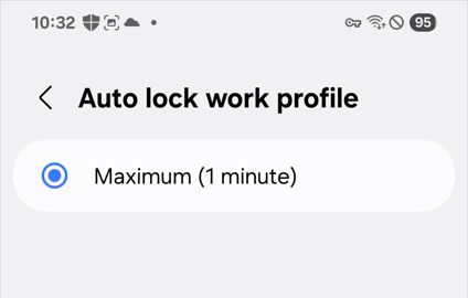 Then I tried to disable One Lock. With this I was able to change the system lock screen settings but on Settings - Security and Privacy - More Security Settings - Work Profile Security - Use one lock I cannot set anything longer than one minute.