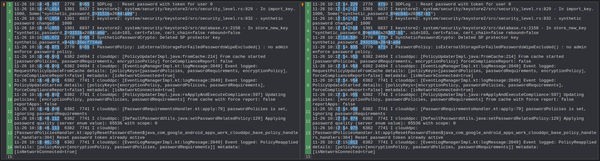 Now I started to look into the adb logs of my device. I sent two reset password commands, one with the Require Entry option enabled and one without. I grepped the logs for "password" as a keyword and compared the results with a tool.