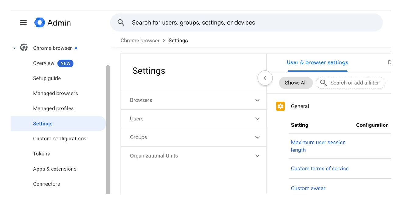 - With the domain verified and licenses activated, your full suite of Chrome Enterprise management visibility will appear.