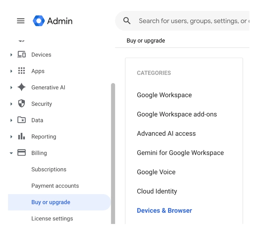 - Navigate to the Billing > Buy or upgrade > Devices & Browsers section within your Admin console.