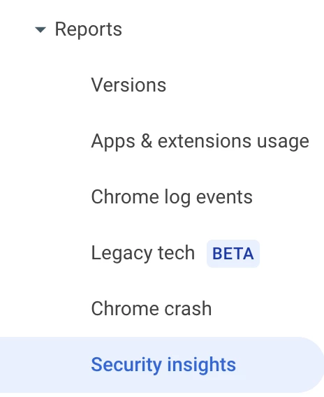 - Navigate to Chrome Browser > Reports > Security Insights.