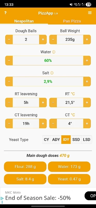 I use the PizzApp+ to get the right ratio of ingredients. See the screenshot for my current preference.